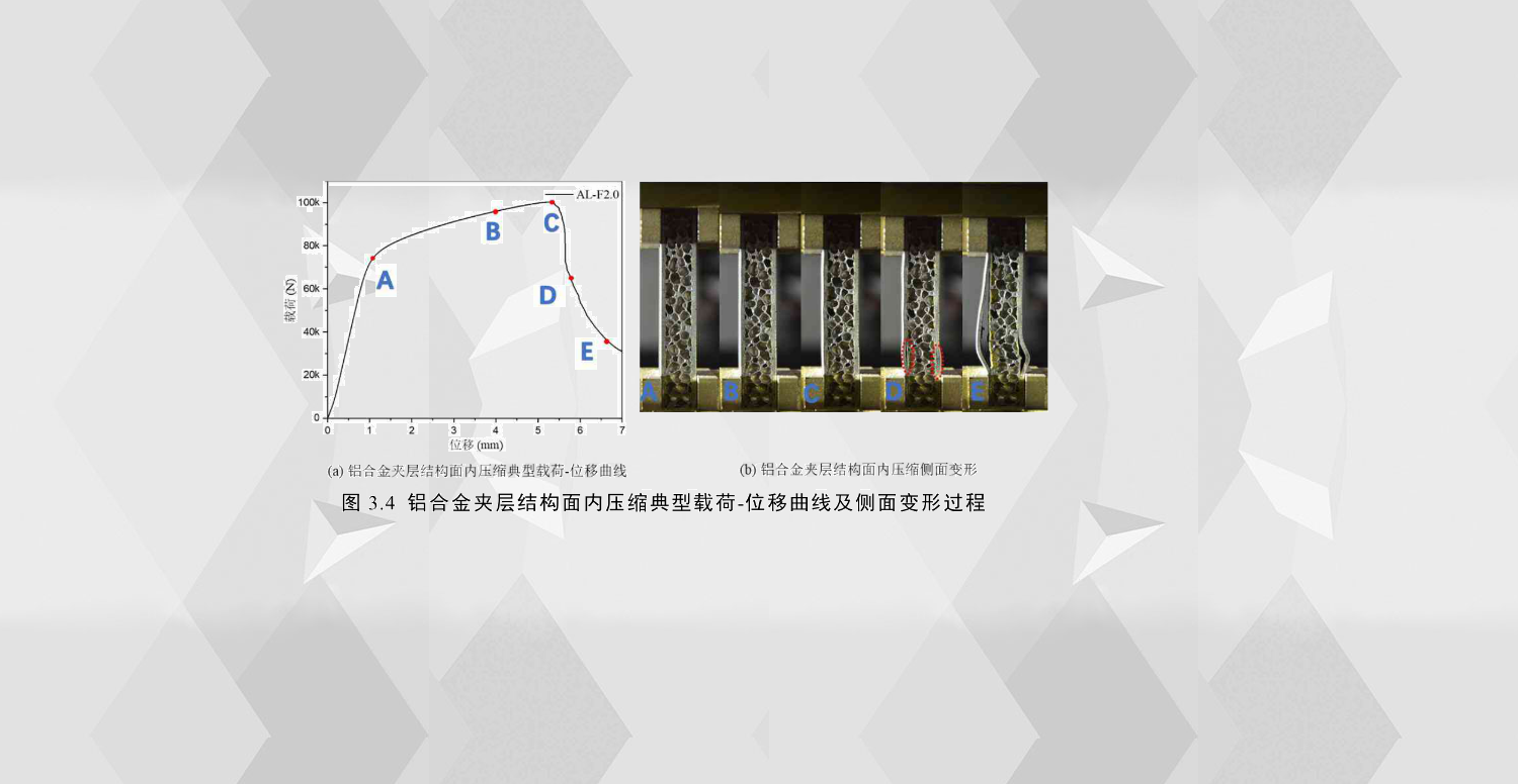 圖3.4(a)描繪了鋁合金夾層結構在面內(nèi)壓縮下典型載荷-位移曲線,其壓潰過程大體可以分為三個階段,O-A彈性階段,此階段結構處于彈性變形,載荷與位移的關系為線性增長;A-C塑性階段,在此階段結構面板受到較大的壓力而產(chǎn)生塑性變形,載荷與位移仍近似呈線性增長趨勢,只是載荷增長幅度遠小于彈性階段增長幅度;C之后屬于后屈曲階段,由于在此階段面板發(fā)生嚴重屈曲變形,并且面板與芯層之間的膠層出現(xiàn)大面積失效,這導致夾層結構的承載能力大大降低,此外,由于泡沫芯層壓縮的效果,在面板失穩(wěn)之后夾層結構仍有較弱的承載能力,并未完全失去承載能力,圖3.4(b)為此試件在圖3.4(a)各點時刻側(cè)面面板與芯層泡沫的變形圖。