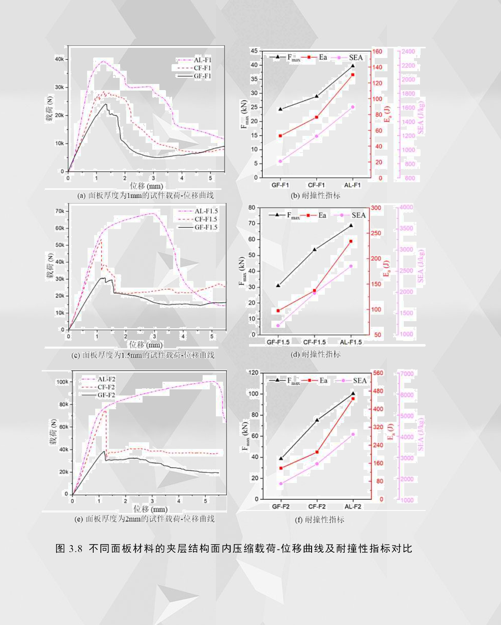 通過比較面板厚度相同但材料不同的夾層結構載荷-位移曲線,如圖3.8所示,可發(fā)現鋁合金夾層結構的曲線高度明顯高于同等面板厚度下的纖維增強夾層結構。由于鋁合金面板的彈性模量比纖維增強復合材料的大,所以夾層結構在第一階段(彈性階段)的斜率最大,即剛度最大。從基材力學測試的數據可以看出,鋁合金面板的極限強度比纖維增強復合材料面板的強度要低,但通過耐撞性指標可以看出,鋁合金夾層結構具有最大的峰值力,造成這種現象的主要原因是由于面板為脆性材料的纖維增強夾層結構的上、下面板之間尺寸誤差或裝配誤差的疊加效應對載荷的損失比面板為彈塑性材料的鋁合金夾層結構的要大得多,而這種疊加效應對彈塑性材料的極限承載能力影響非常小,從而解釋了鋁合金夾層結構比纖維夾層結構具有更大的極限載荷。此外,在纖維增強夾層結構的失效過程可以看出,纖維增強夾層結構面板的脆性斷裂通常首先僅發(fā)生在某一面板,而不是兩面板同時脆性斷裂,這也解釋了面板疊加效應的存在。通過不同面板材料的夾層結構面內壓縮的耐撞性指標比較可以看出,在具有相同尺寸配置的前提下,鋁合金夾層結構有最好的耐撞性能,而玻璃纖維夾層結構有最差的耐撞性能。