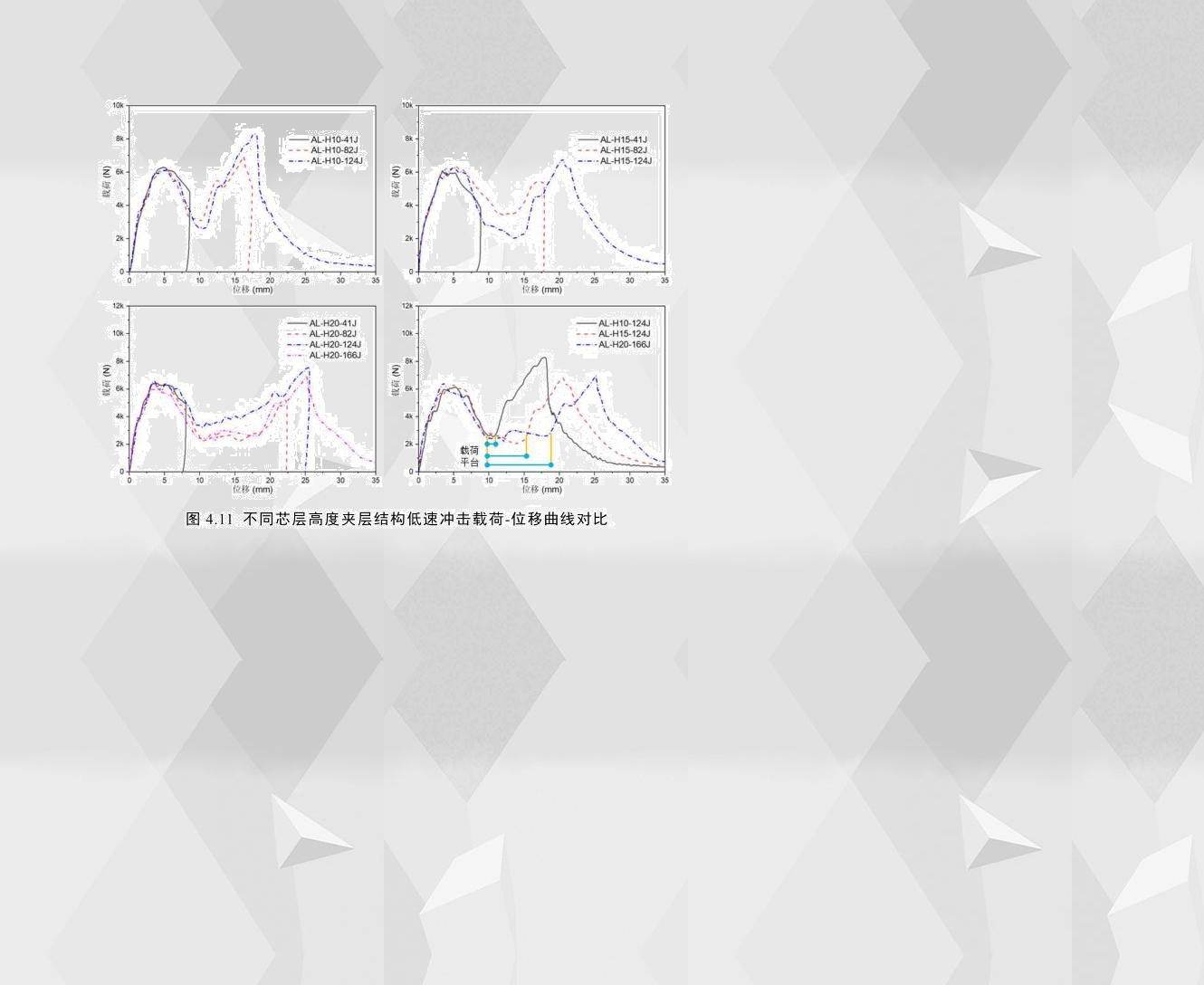 4.11為相同配置的夾層結構在不同沖擊能量下及不同芯層高度的試件在穿透能下的載荷-位移曲線,通過對比可以看出,芯層高度為10mm、15mm和20mm的試件的載荷-位移曲線基本相似,曲線均具有兩個波峰且波谷處載荷大小相差不大;不同的是,隨著試件芯層高度的增加,波谷附近的載荷平臺的長度逐漸變長。