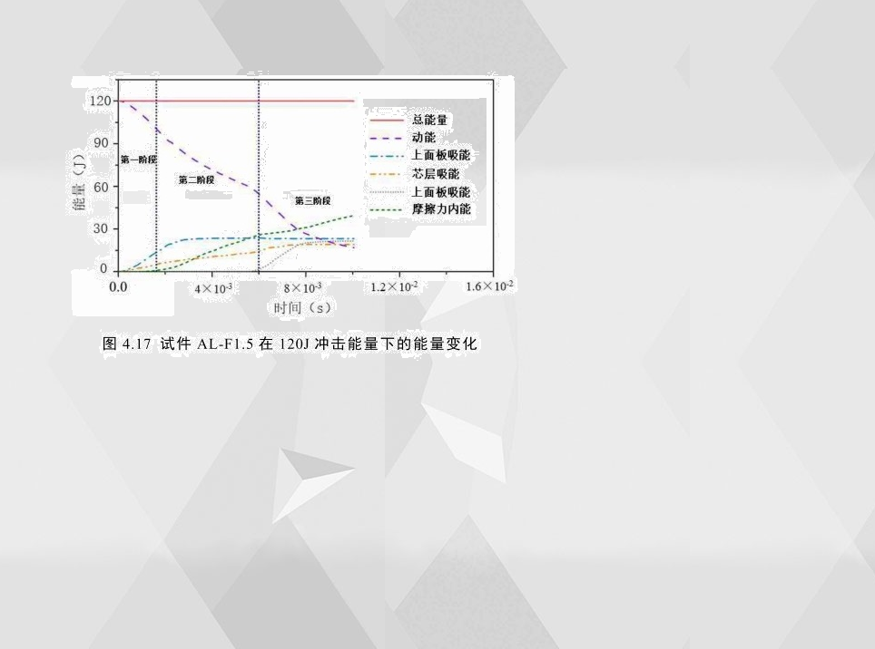4.17為試件AL-F1.5的各組成部分在低速沖擊仿真中能量變化。從圖中可以看出,初始沖擊能量主要由上下面板、泡沫鋁芯層的內(nèi)能以及各組成部分的摩擦能四部分組成。從各部分能量轉(zhuǎn)化趨勢可以看出,整個沖擊過程基本可以分為三個階段。第一階段主要由上面板吸收能量,摩擦力做功較少。第二階段摩擦力做功迅速增加,成為主要吸能部分。第三階段由于下面板發(fā)生較大塑性變形,下面板成為主要吸能部分。